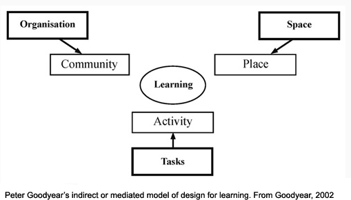 Wenger’s architecture of design has been extremely influential and finds echoes in several subsequent models of learning design – for example, Peter Goodyear’s indirect design framework, in which the designer’s intentions for the Space, Task and Organisation of the learning, are in practice always negotiated by teachers and learners into mediated, co-constructed Places, Activities and Communities for learning.