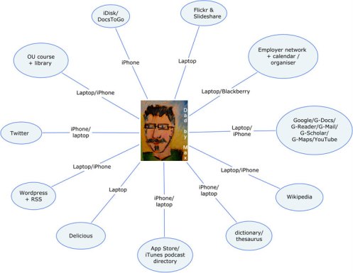 What does your personal learning environment look like? It’s a useful exercise – one we’ve been doing this week – to picture your own day-to-day engagement with digital devices, networks and services and then to look at that picture as a set of bespoke educational tools: a Personal Learning Environment. My PLE looks something like this: